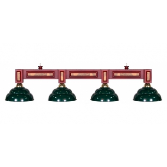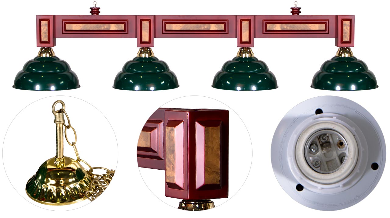 Изысканная лампа с плафонами необычного дизайна органично впишется в любой интерьер. Великолепно будет сочетаться с бильярдными столами серии "Денди". Устойчивые к механическим повреждениям металлические плафоны на деревянной штанге обеспечивают не только качественное освещение игрового поля, но и создают уютную атмосферу в бильярдном клубе или кабинете. Комплектуется цепочками и чашками для крепления к потолку.