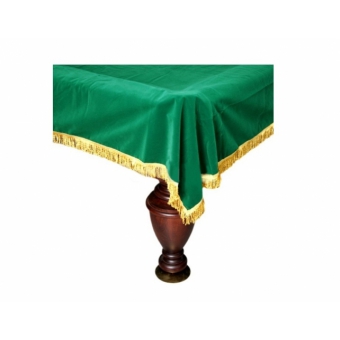 Бильярдный бархатный чехол с желтой бахрамой. Покрывало защитит бильярдноый стол от пыли, грязи и ультрафиалета. Бильярдное сукно столов дольше сохранит цвет и прослужит дольше, поскольку при использовании покрывала стол можно чистить реже. Ткань - зеленый бархат. Бахрома желтая. Производство - Россия.