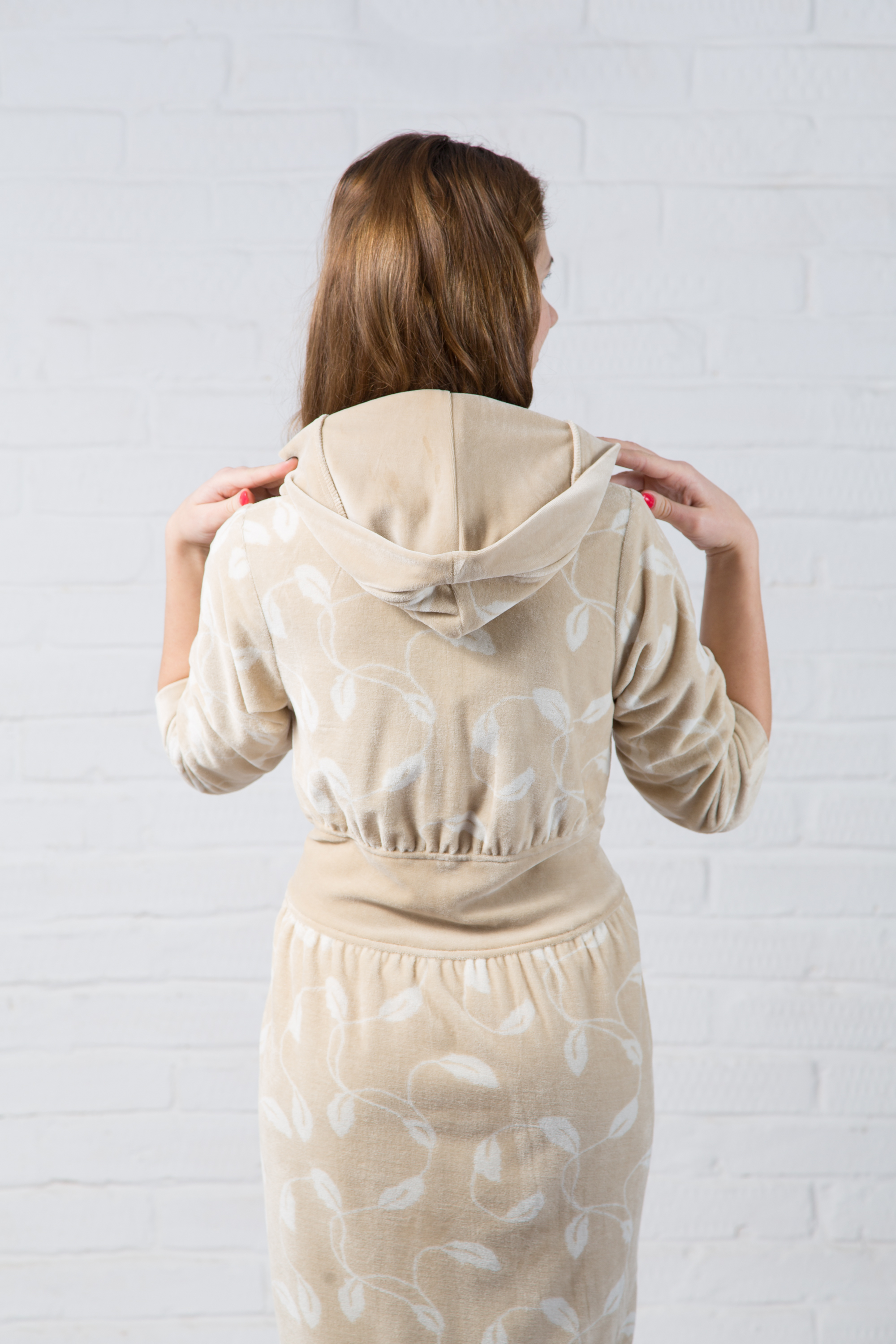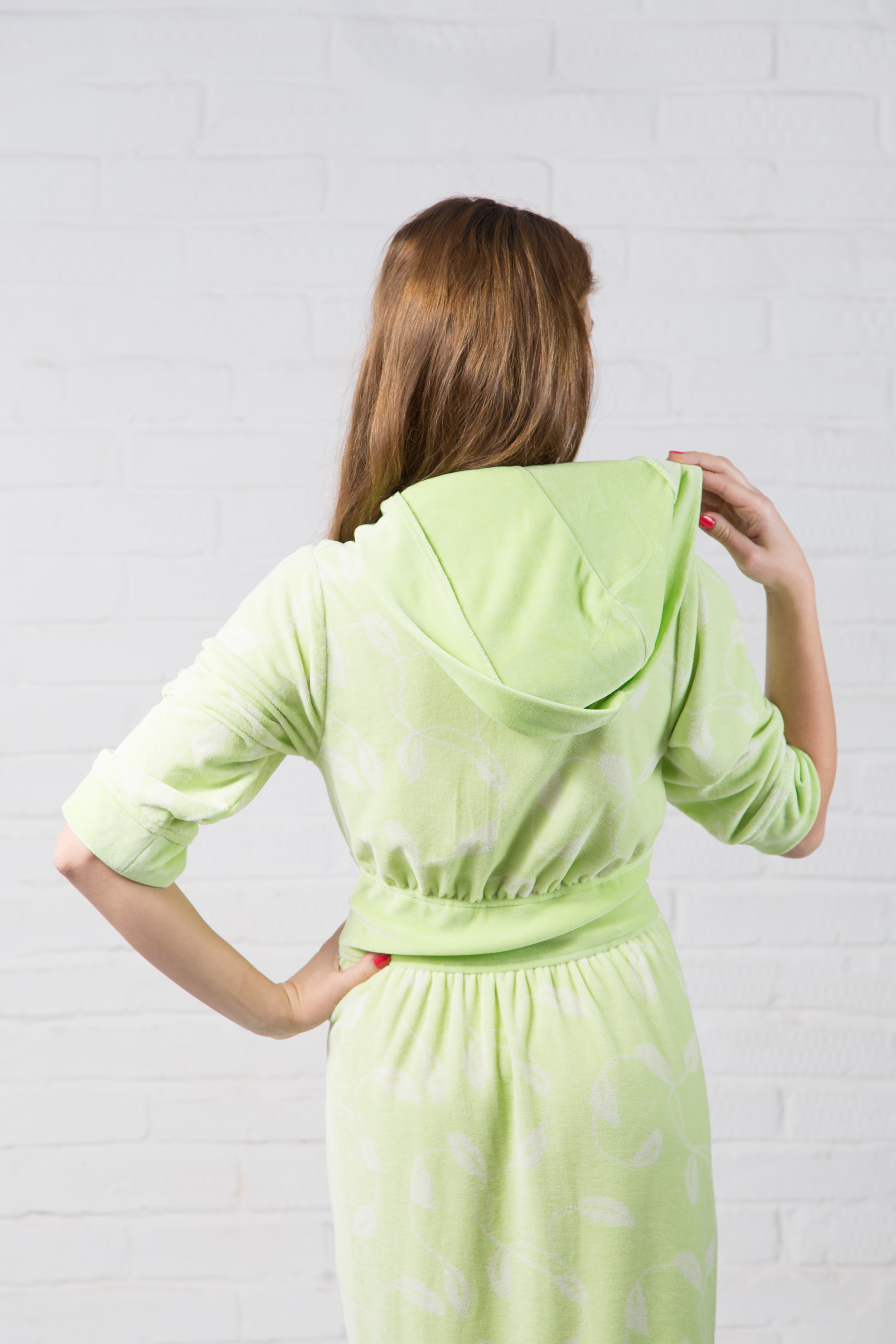 Цена: 2900 р. Для заказа укажите количество товара в пустых клетках таблицы: Коротенький халат с капюшоном и вшитым поясом. По всему халату узор в виде нежных листочков. Состав: Бамбук