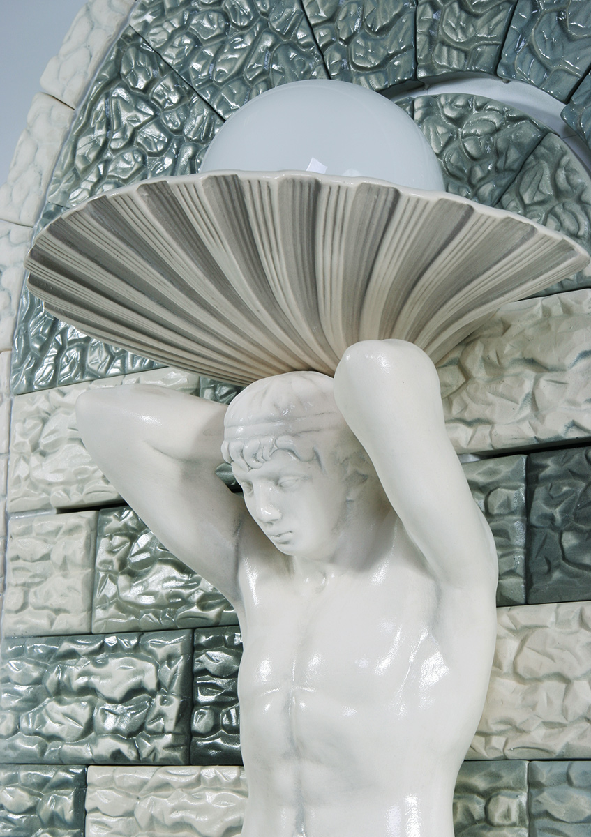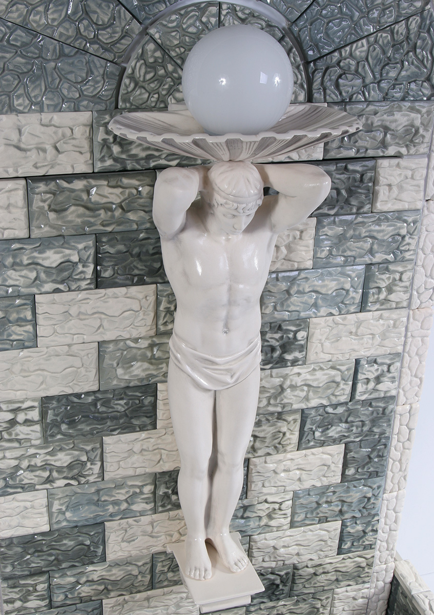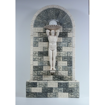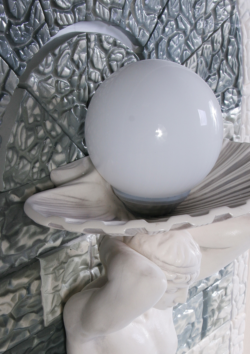 Пристенный водопад в античном стиле. Атлант держит на плечах на плечах раковину с жемчужиной. Жемчужина сделана из непрозрачного стекла и подсвечивается изнутри. Вода вытекает из горизонтального излива на уровне головы скульптуры и равномерно стекает по все поверхности. Размеры (ВxШxД): 168x90x30 см Особенности фонтана: