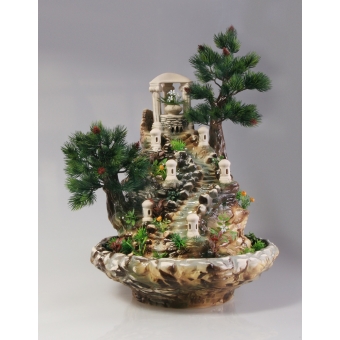 Цена: 27000 р. Доставим завтра Дополнительная комплектация: F84-PH с белой подсветкой 28200 руб. F84-PLT с туманом и разноцветной подсветкой 30800 руб. Крупный настольный фонтан средних размеров с двумя хвойными деревьями, беседкой с колоннами и малыми архитектурными формами. Источник воды расположен под беседкой. Вода стекает по тропинке, нисходящей от беседки. Напор воды изменяется простой настройкой регулятора на насосе от средней громкости журчания до почти беззвучного тихого течения. Фонтан декорирован искусственной зеленью — травой и цветами. Размеры (ВxШxД): 57x42x44 см Особенности фонтана: