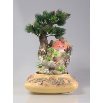 Цена: 15000 р. Доставим завтра Домашний настольный фонтанчик с домиком в китайском стиле, хвойным деревом и ёмкостью с барельефом в виде китайского дракона. Источник воды находится в корнях дерева. Размеры (ВxШxД): 37x24x24 см Особенности фонтана: