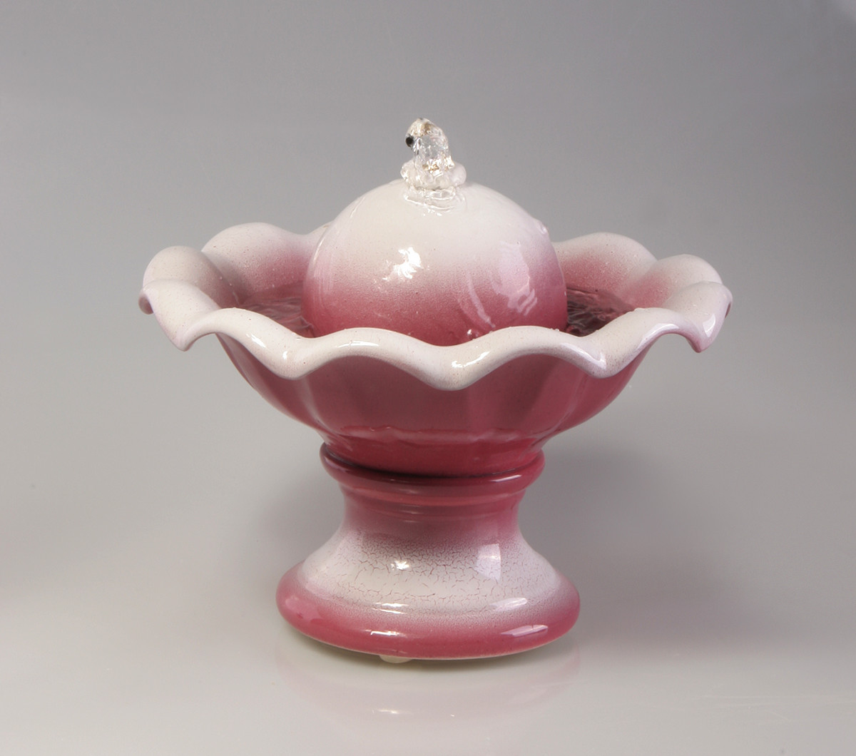 Настольный фонтан для дома или офиса, средних размеров. Выпускается в двух вариантах: с шаром в центре или стеклянным цветком. Размеры (ВxШxД): 26x30х30 см Особенности фонтана: