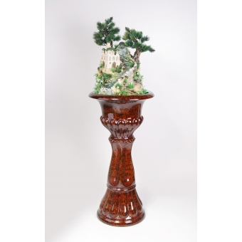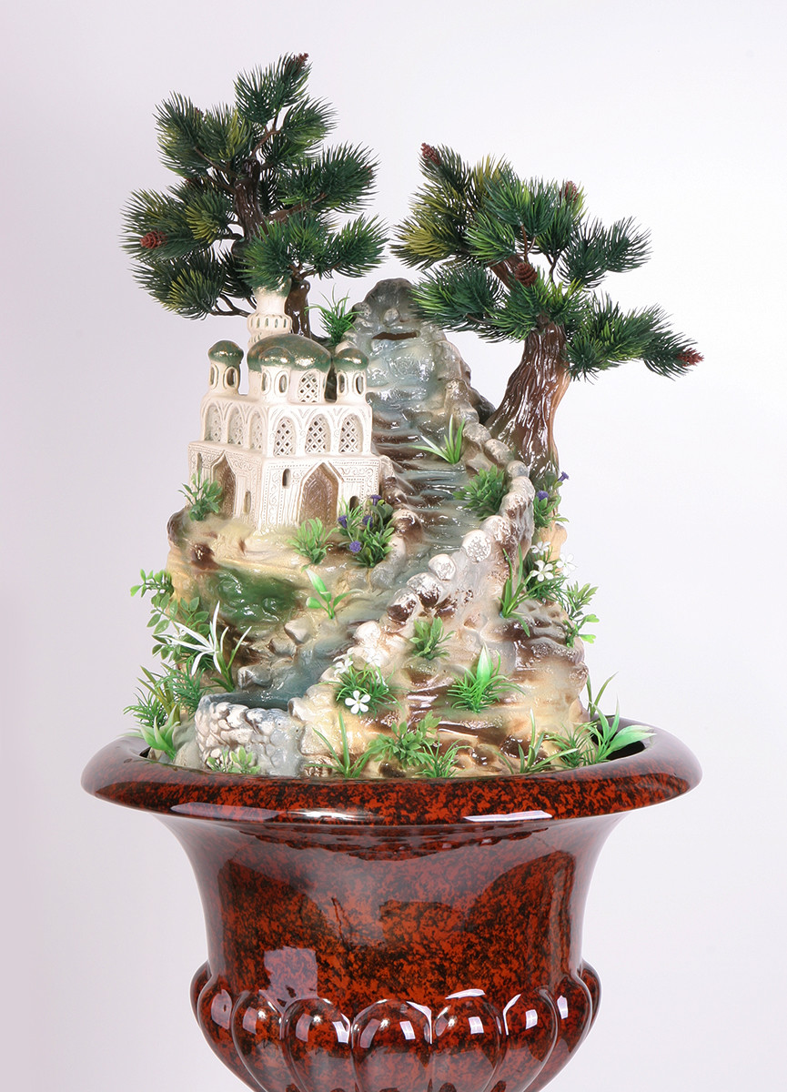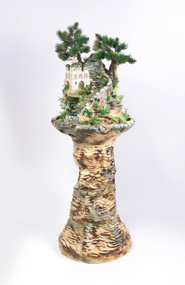 Цена: 51000 р. Доставим завтра Дополнительная комплектация: F336-PLT с туманом и разноцветной подсветкой 54800 руб. Напольный фонтан среднего размера для загородного дома. Комплектуется на выбор одним из четырех видов кашпо: под камень, дерево, а также классическим зеленым или коричневым. В основе композии — мечеть, расположенная на скалистом склоне у горного ручья и двух сосен. Размеры (ВxШxД): 110x44x44 см Особенности фонтана: