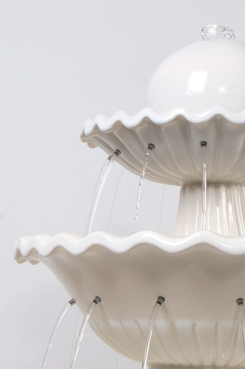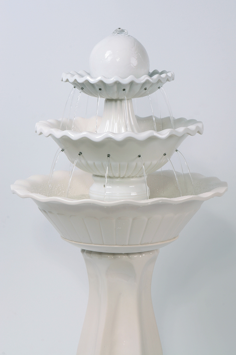 Классический среднеразмерный напольный фонтан для коттеджа или офиса с классическим интерьером, покрытый молочно-белой глянцевой глазурью. Вода вытекает из верхней точки шара и через тонкие металлические трубки из нержавеющей стали перетекает сначала из малой чаши в среднюю, потом из средней — в большую. Высота фонтана — 105 см. Размеры (ВxШxД): 105x48x48 см Особенности фонтана: