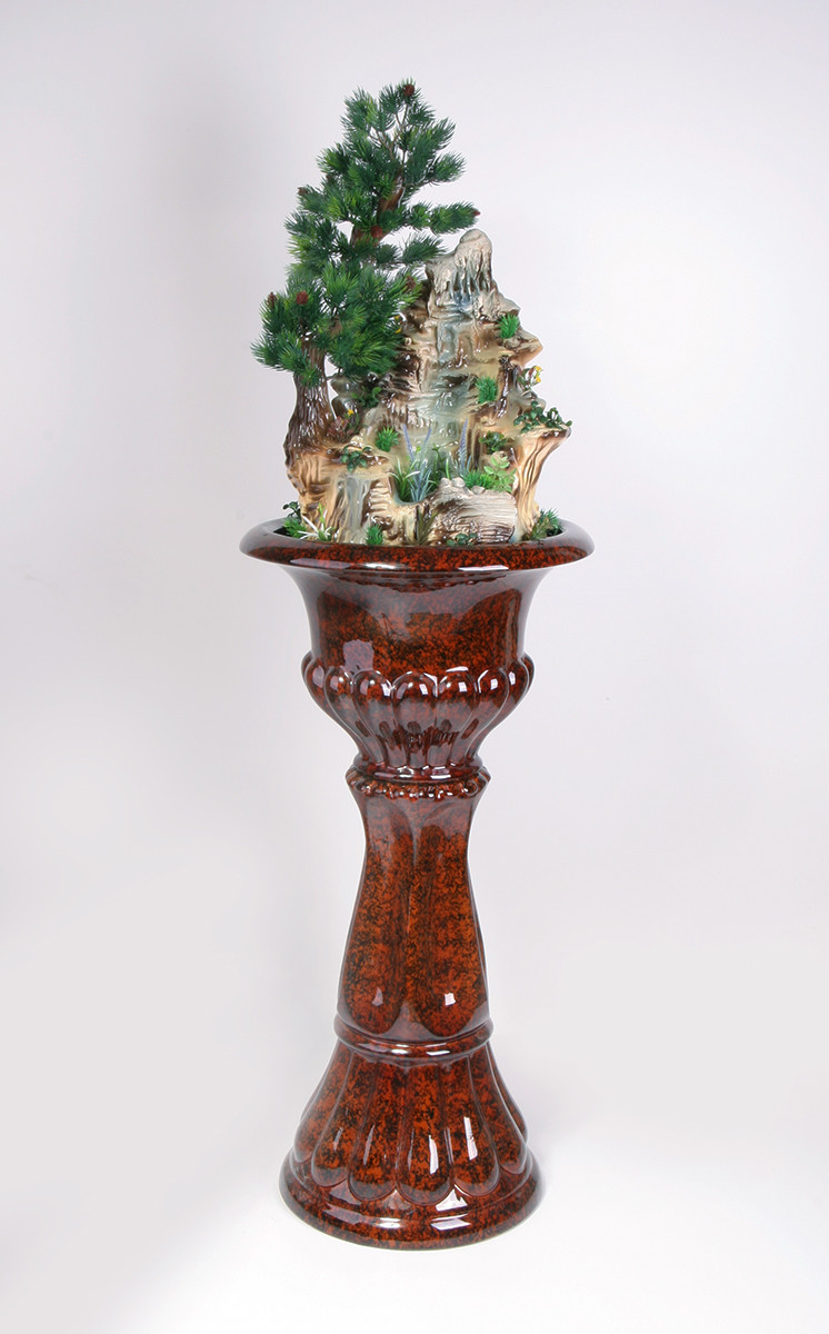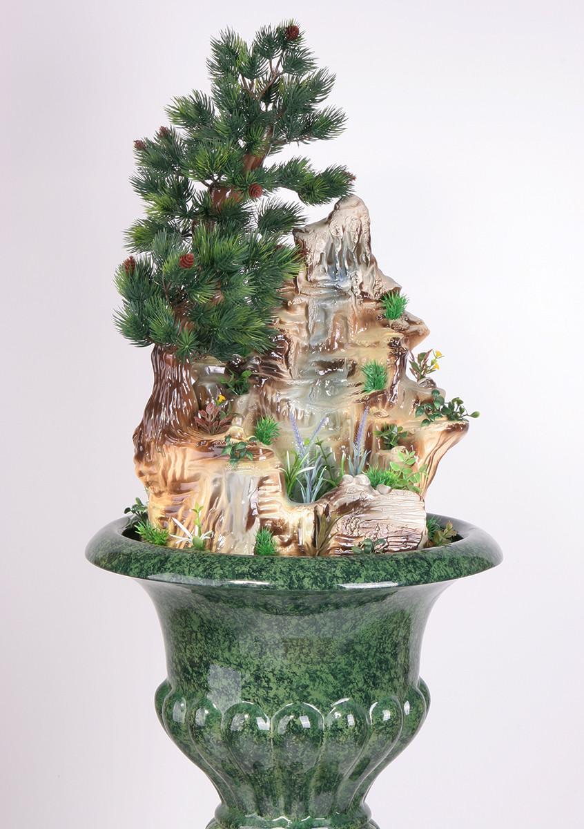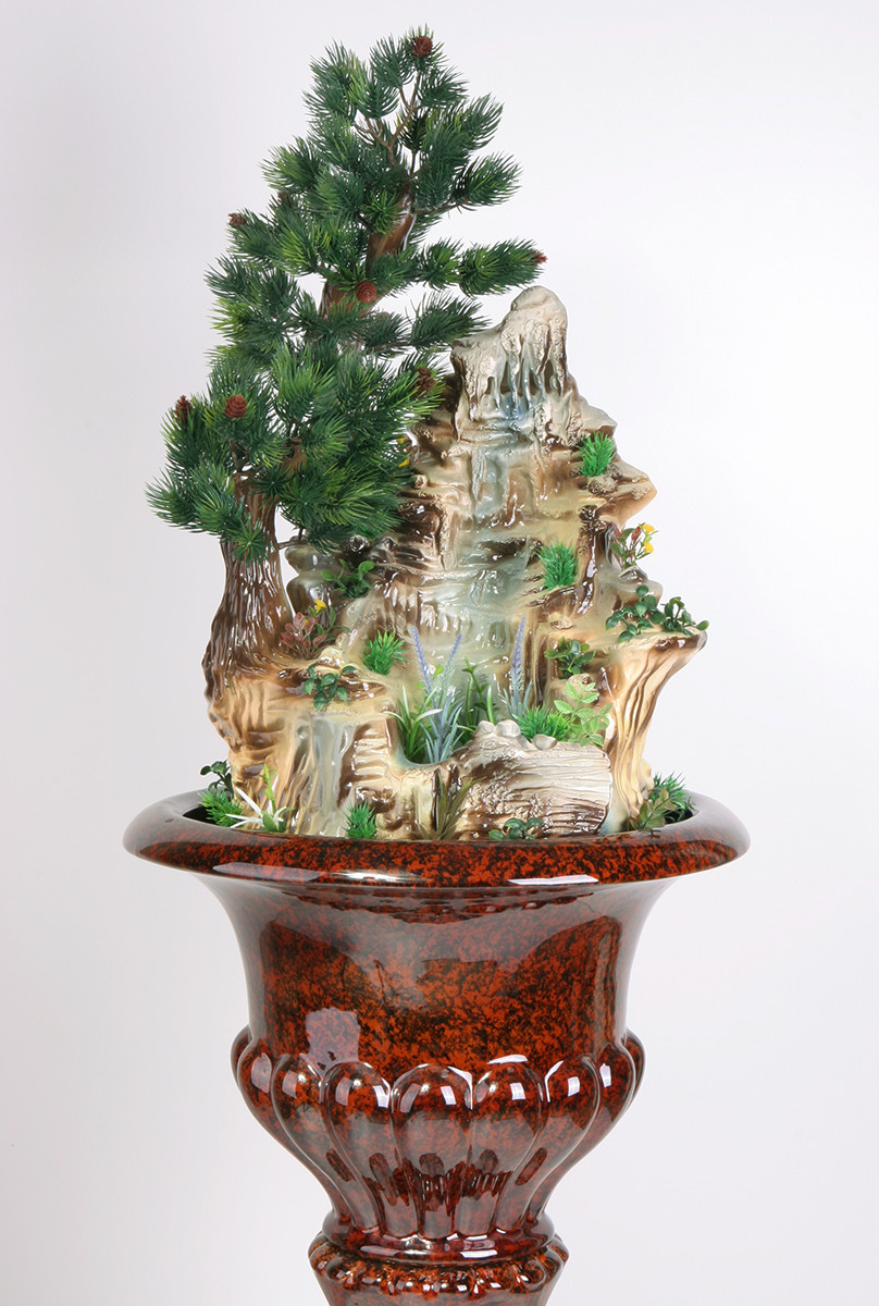 Цена: 47000 р. Доставим завтра Дополнительная комплектация: F301-PLT с туманом и разноцветной подсветкой 50800 руб. Напольный фонтан для коттеджа средних размеров на пьедестале со скалой и хвойным деревом. Источник воды расположен в верхнем ярусе скалы. Вода стекает по скалистым каскадам в резервуар. Мощность потока настаивается простым регулятором на насосе. Размеры (ВxШxД): 136x42x44 см Особенности фонтана: