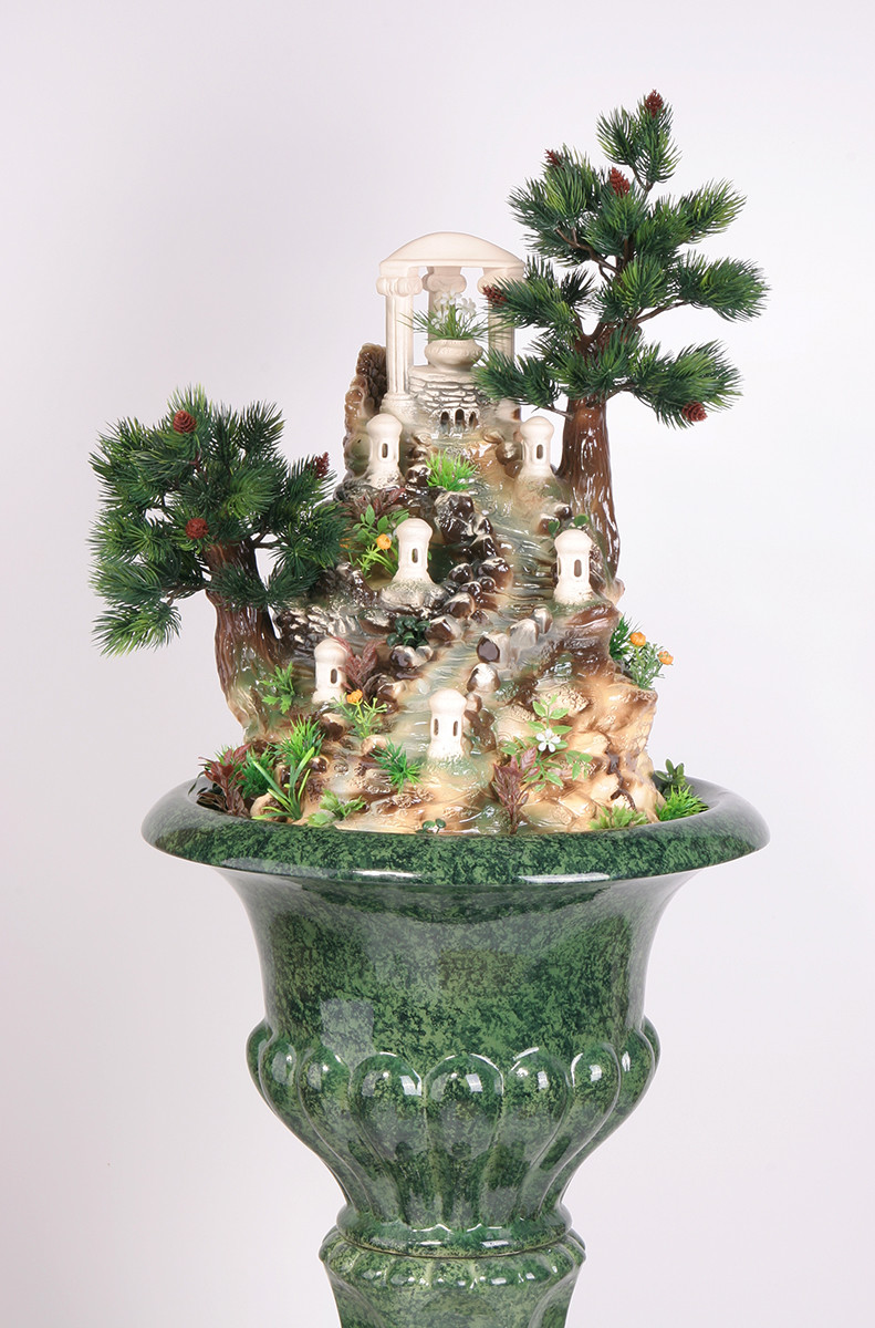 Цена: 49000 р. Доставим завтра Дополнительная комплектация: F309-PLT с туманом и разноцветной подсветкой 52800 руб. Классический напольный фонтан средних размеров с двумя хвойными деревьями и беседкой с малыми архитектурными формами. Источник воды расположен под беседкой. Вода стекает по тропинке, нисходящей от беседки. Напор воды изменяется простой настройкой регулятора на насосе от средней громкости журчания до почти беззвучного тихого течения. Размеры (ВxШxД): 132x42x44 см Особенности фонтана: