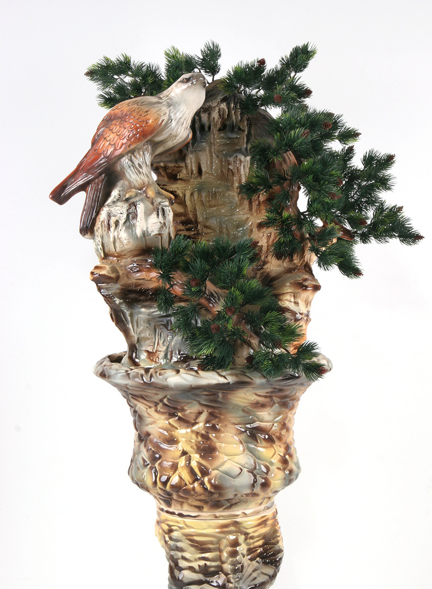 Цена: 37900 р. Доставим завтра Дополнительная комплектация: F341-PLT с туманом и разноцветной подсветкой 41700 руб. Полутораметровый напольный фонтан для загородного дома . Композиция состоит из фигуры орла, сидящего на скале с хвойным деревом. Источник воды расположен в верхнем ярусе скалы. Вода стекает по поверхности скалы в резервуар. Мощность потока воды легко регулируется переключателем на насосе. Размеры (ВxШxД): 145x42x54 см Особенности фонтана: