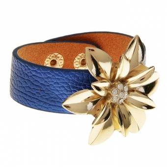 Изящный браслет MIN - универсальный аксессуар. Основание из натуральной кожи синего цвета дополнено лилией из позолоченного сплава. Детали: застежка на кнопки, декор сверкающими стразами SWAROVSKI