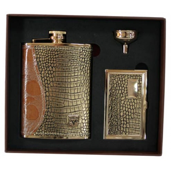 Ваша реклама Здесь 500 подарков | Каталог | Деловые аксессуары | Портмоне, портсигары, кошельки, визитницы, ключницы | Подарочный набор VIRON: фляжка 8oz, воронка, визитница