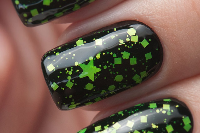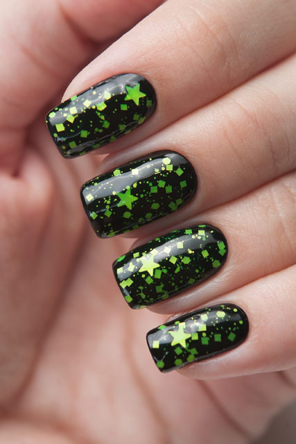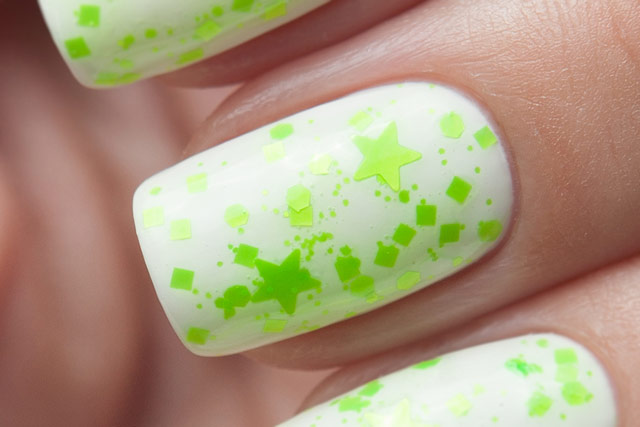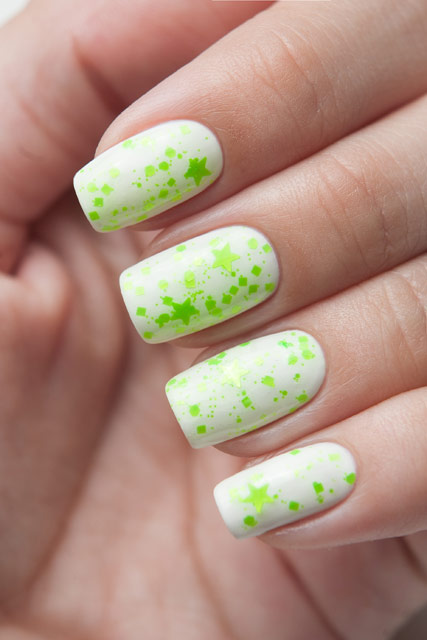 Цена: 280 р. Доставим завтра Яркий зелёный неоновый глиттер в этом топе можно увидеть в форме звёзд, шестиугольников разного размера и квадратиков.