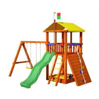 Цена: 53500 р. Доставим завтра каркас игрового домика изготовлен из многослойного клееного соснового бруса толщиной 85мм; пол, ограждения из массива сосны толщиной 17 мм; яркая натяжная крыша; песочница; деревянная лестница; скалодром с канатом; качели; флаг; горка. Габариты: внешние размеры 4,4м х 3,9м; высота 3,2м; длина горки 3м .