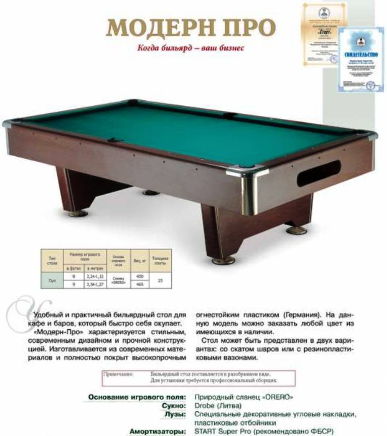 Бильярдный стол «Модерн-Про» характеризуется стильным, современным дизайном и прочной конструкцией. Изготавливается из современных материалов и полностью покрыт высокопрочным огнестойким пластиком (Германия). На данную модель можно заказать любой цвет из имеющихся в наличии. Стол «Модерн-Про» может быть представлен в двух вариантах: со скатом шаров или с резино-пластиковыми вазонами. Производство "Старт", Новосибирск. Сукно: Кинг